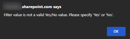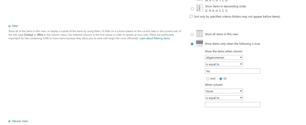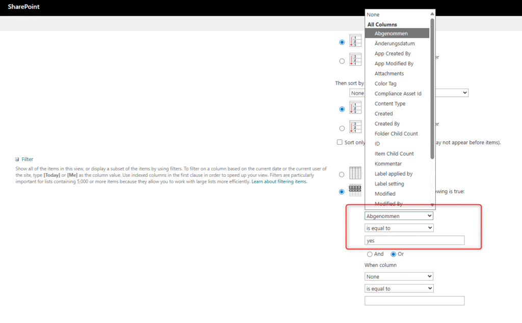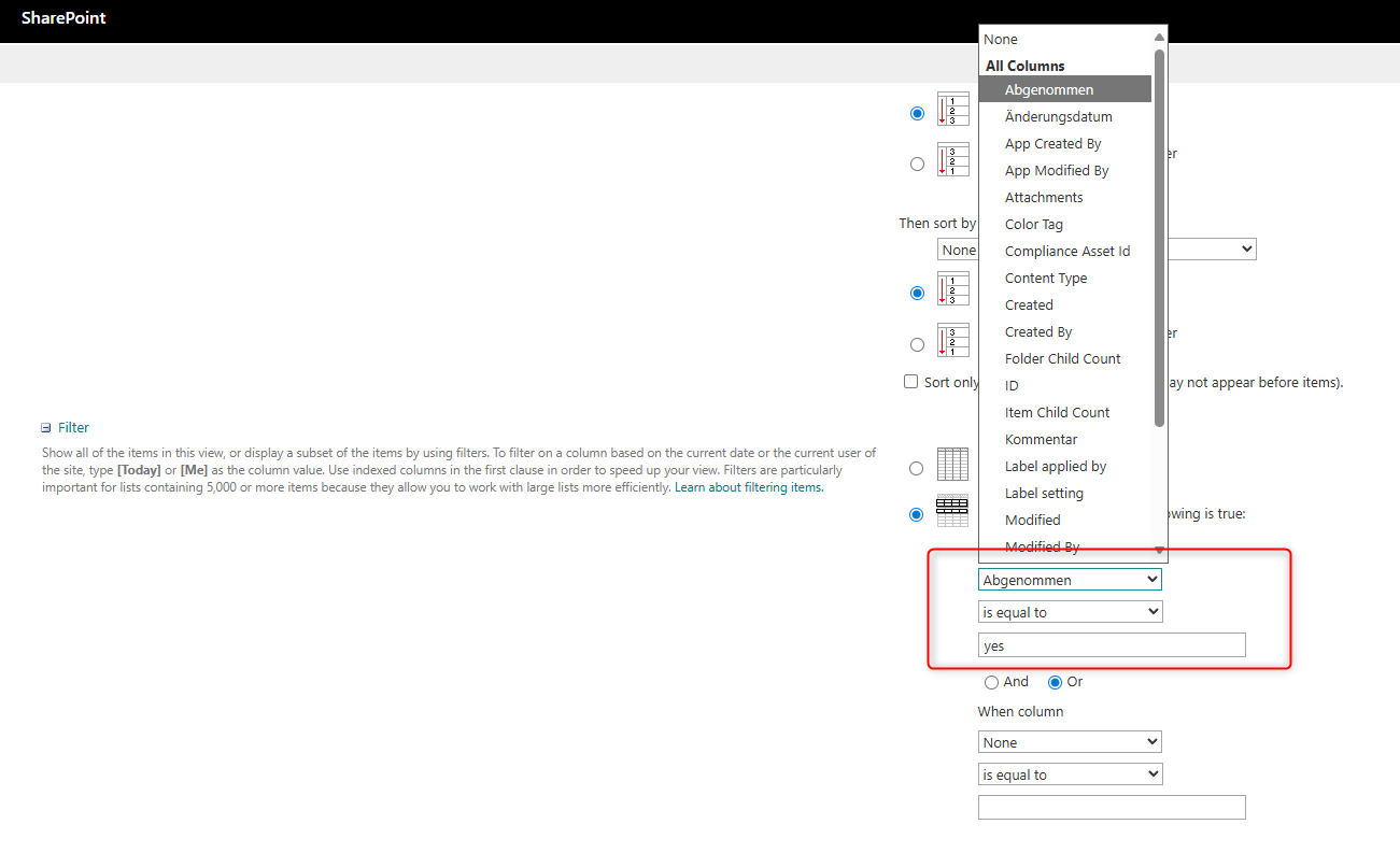Innerhalb der Sharepoint-Ansicht kann nun nach unten zu „Filter“ gescrollt werden und die entsprechenden Parameter angepasst werden. In meinem Fall möchte ich alle abgenommenen Einträge angezeigt bekommen, also muss folgende Option gesetzt werden. Yes oder im deutschen Ja